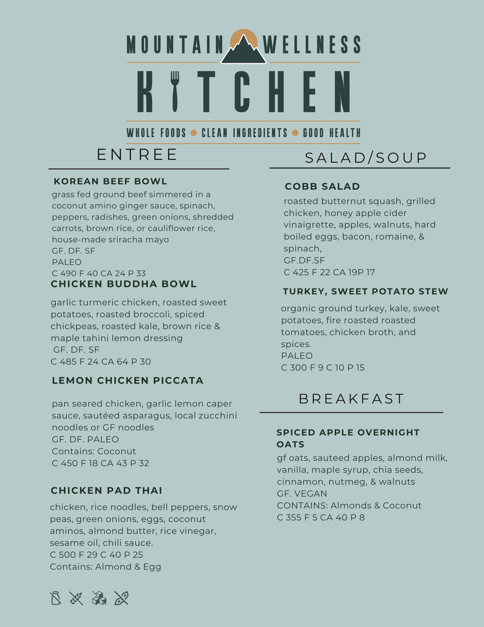At Mountain Wellness Kitchen, we craft our meals from scratch using high-quality, real whole foods sourced locally. Our menu may vary slightly based on local availability.